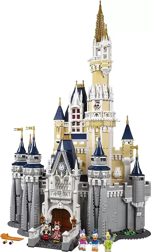 Bring the magical world of Disney to your home with The Disney Castle. This highly detailed LEttgGO model with over 4,000 pieces offers a rewarding build and play experience, and comes with an array of exciting Disney-themed features and functions. The intricately detailed facade and towers replicate the iconic Walt Disney World Resort Cinderella Castle, and each accessible castle room includes special features inspired by some of Disney’s greatest animated feature films, providing endless play possibilities with the included minifigures: Mickey Mouse, Minnie Mouse, Donald Duck, Daisy Duck and Tinker Bell, or other characters from your collection. Castle main building first floor features the main hall with large arched doorway, mosaic floor tiling, ornate chandelier, suits of armor, shield-decorated walls, grandfather clock, floor-standing vase with buildable flower elements, magic carpet and a golden lamp. Castle main building second-floor room features buildable dark-blue curtains with curtain pole, ornate buildable candelabra and rose, and glass case elements. Castle main building third-floor room features a chest with book of spells, mop and bucket elements, and access to the main tower second-floor room. Castle main building fourth-floor bedroom features a detailed bed with decorative golden headboard elements. Main tower first-floor kitchen features a large redbrick-patterned stove, workbench, buildable broom and pumpkin, plus pots, pans and assorted kitchen and food elements. Main tower second-floor room includes a spinning wheel and access to the castle main building third-floor room. Main tower third-floor room features a chest containing brush, scissor and lock of black hair elements, plus a balcony with 2 stud shooters for a firework-display function. Main tower fourth-floor room features a golden mirror, plus red apple and glass vase elements. Main tower fifth-floor room features a window bench and an arched window.