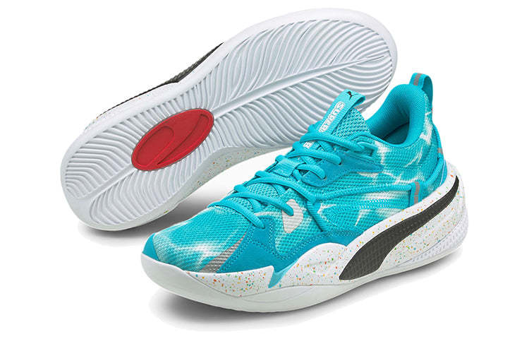 The Nintendo x J.Cole x PUttgMA RS-Dreamer 'Super Mario Sunshine' is a commemorative hoops shoe celebrating the 35th anniversary of the Super Mario franchise. The tropical setting of Isle Delfino inspires its vibrant colorway, featuring a watery blue textile upper with Shine Sprites adorning the heel tabs. Multicolor speckled detailing cover the ProFoam midsole, equipped with RS-Foam in the heel for superior impact protection. J. Cole's signature makes this an instant classic for any fan of the game or hip hop.